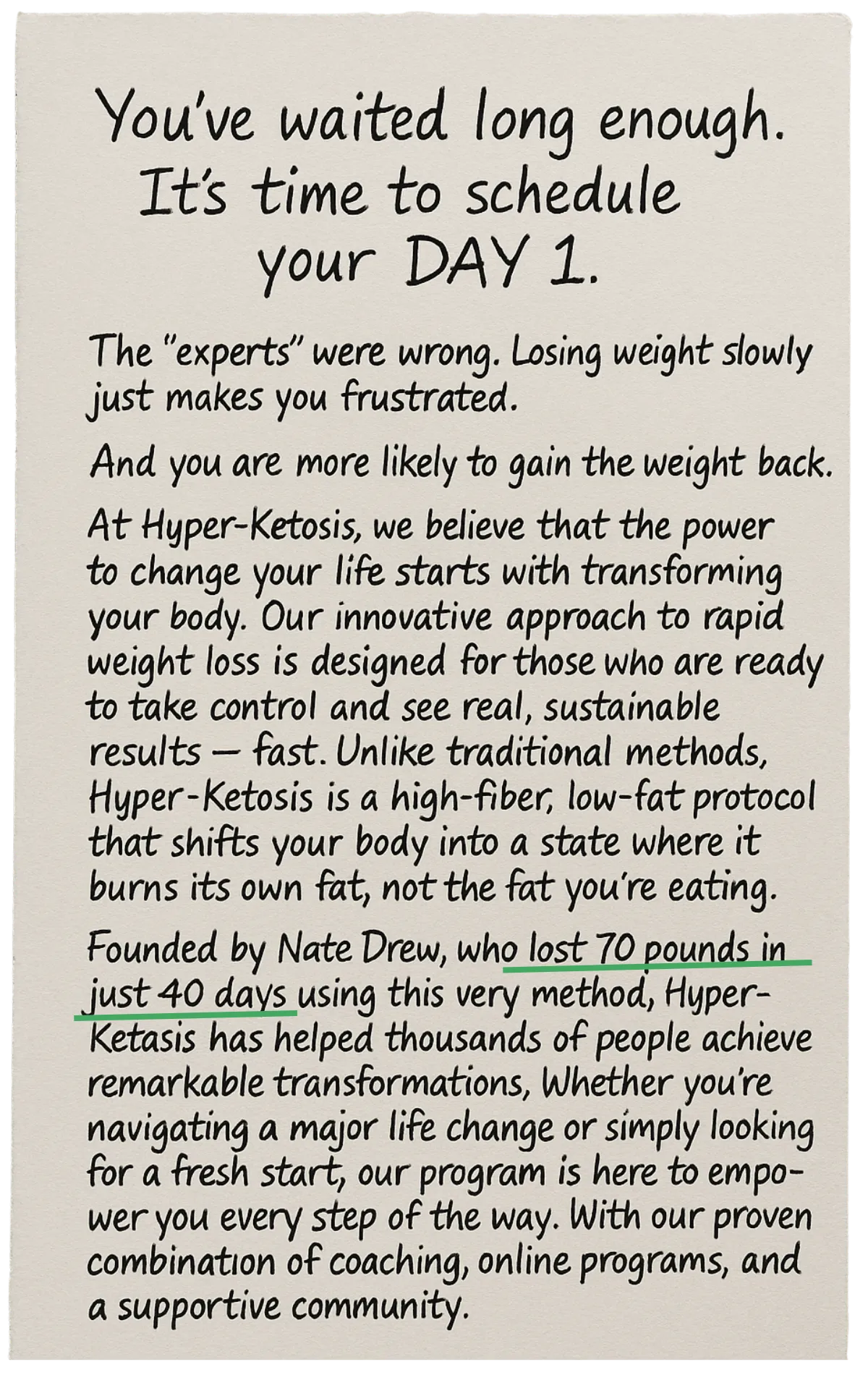 Nate Drew is a pioneering leader in the world of rapid weight loss, known for his groundbreaking Hyper-Ketosis method. With a passion for helping people transform not only their bodies but their lives, Nate has developed a unique approach that combines high-fiber, low-fat nutrition with a specific protocol designed for the fastest weight loss results possible. After personally losing 70 pounds in just 40 days, he’s now dedicated to guiding others to achieve similar life-changing transformations.